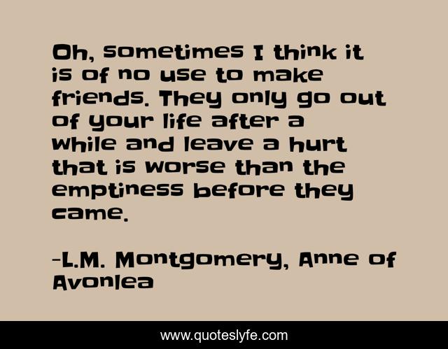 This page presents the quote "Oh, sometimes I think it is of no use to make friends. They only go out of your life after a while and leave a hurt that is worse than the emptiness before they came.". Author of this quote is L.M. Montgomery, Anne of Avonlea. This quote is about friendship, pain, hurt,.