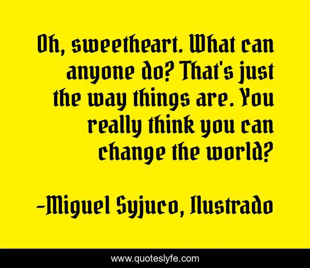 This page presents the quote "Oh, sweetheart. What can anyone do? That's just the way things are. You really think you can change the world?". Author of this quote is Miguel Syjuco, Ilustrado. .