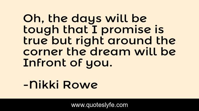 This page presents the quote "Oh, the days will be tough that I promise is true but right around the corner the dream will be Infront of you.". Author of this quote is Nikki Rowe. This quote is about life, strength, success, big-dreams, freedom, courage, quote, dreamer, dream,.