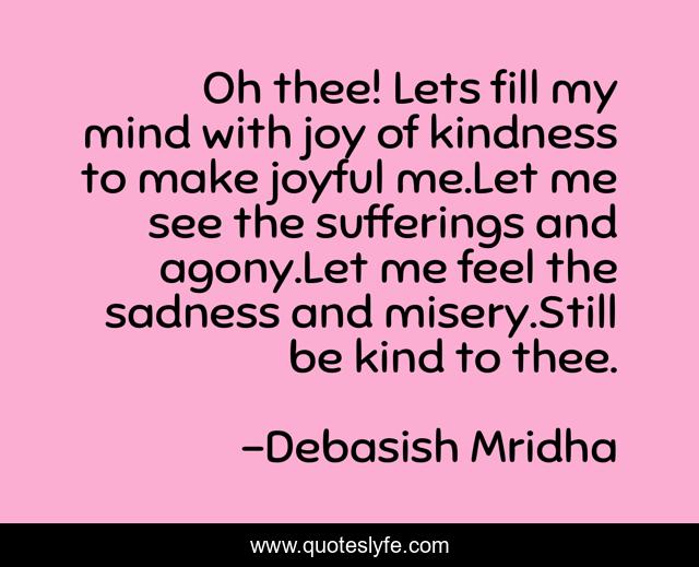 This page presents the quote "Oh thee! Lets fill my mind with joy of kindness to make joyful me.Let me see the sufferings and agony.Let me feel the sadness and misery.Still be kind to thee.". Author of this quote is Debasish Mridha. This quote is about life, love, knowledge, inspirational, intelligence, philosophy, wisdom, quotes, affection,.
