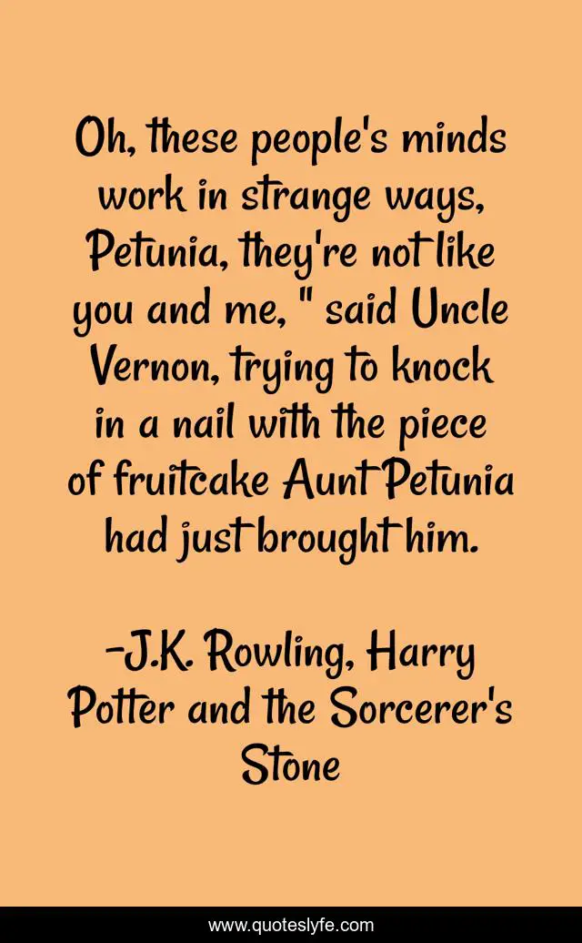 This page presents the quote "Oh, these people's minds work in strange ways, Petunia, they're not like you and me, " said Uncle Vernon, trying to knock in a nail with the piece of fruitcake Aunt Petunia had just brought him.". Author of this quote is J.K. Rowling, Harry Potter and the Sorcerer's Stone. This quote is about sorcerer-s, stone, j-k, harry-potter, rowling, fantasy,.
