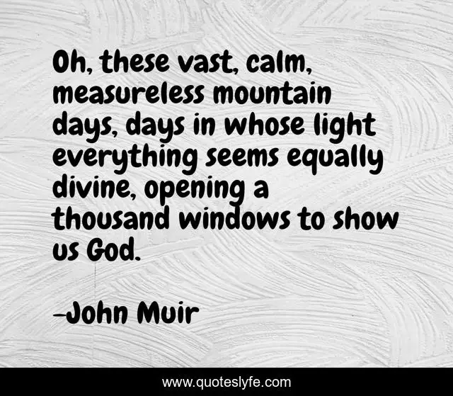 This page presents the quote "Oh, these vast, calm, measureless mountain days, days in whose light everything seems equally divine, opening a thousand windows to show us God.". Author of this quote is John Muir. This quote is about light, calm, mountain,.