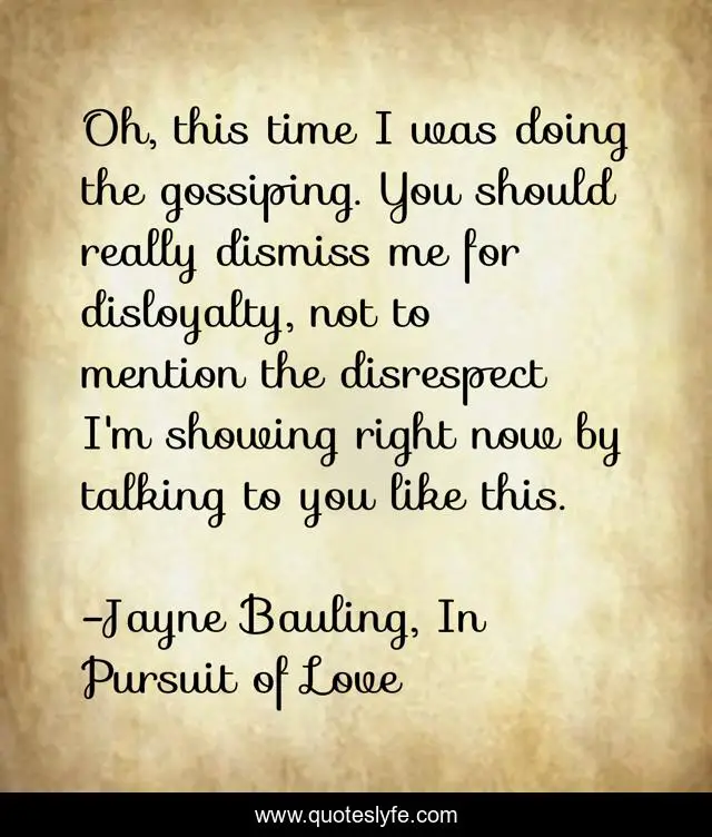 This page presents the quote "Oh, this time I was doing the gossiping. You should really dismiss me for disloyalty, not to mention the disrespect I'm showing right now by talking to you like this.". Author of this quote is Jayne Bauling, In Pursuit of Love. This quote is about disloyal, disloyalty, fire, dismiss, boss, disrespect, employee, gossip,.