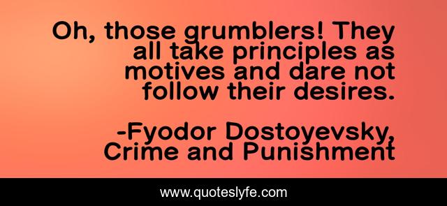 This page presents the quote "Oh, those grumblers! They all take principles as motives and dare not follow their desires.". Author of this quote is Fyodor Dostoyevsky, Crime and Punishment. This quote is about grumblers, principles, desires,.