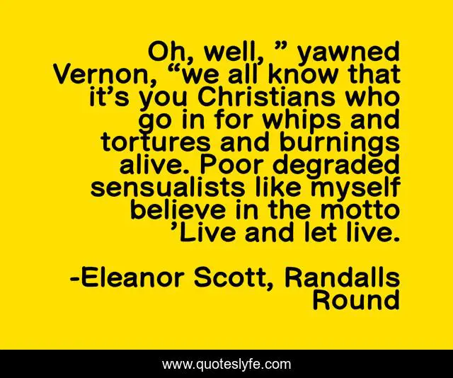 This page presents the quote "Oh, well, ” yawned Vernon, “we all know that it’s you Christians who go in for whips and tortures and burnings alive. Poor degraded sensualists like myself believe in the motto ’Live and let live.". Author of this quote is Eleanor Scott, Randalls Round. This quote is about bigotry, christianity,.