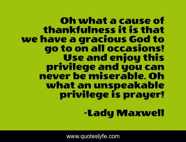 This page presents the quote "Oh what a cause of thankfulness it is that we have a gracious God to go to on all occasions! Use and enjoy this privilege and you can never be miserable. Oh what an unspeakable privilege is prayer!". Author of this quote is Lady Maxwell. .