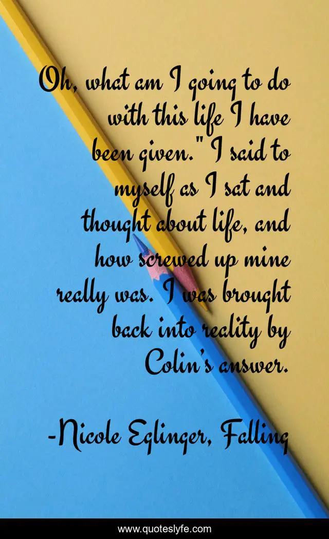 This page presents the quote "Oh, what am I going to do with this life I have been given." I said to myself as I sat and thought about life, and how screwed up mine really was. I was brought back into reality by Colin’s answer.". Author of this quote is Nicole Eglinger, Falling. .