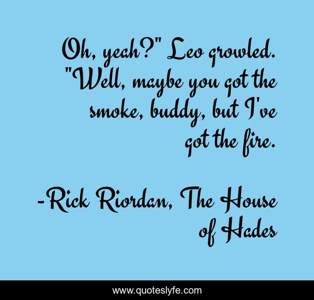 This page presents the quote "Oh, yeah?" Leo growled. "Well, maybe you got the smoke, buddy, but I've got the fire.". Author of this quote is Rick Riordan, The House of Hades. This quote is about fire, leo-valdez, smoke, leo,.