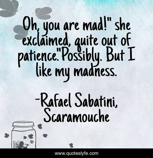 This page presents the quote "Oh, you are mad!" she exclaimed, quite out of patience."Possibly. But I like my madness.". Author of this quote is Rafael Sabatini, Scaramouche. .