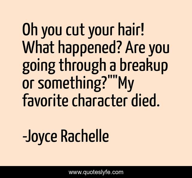 This page presents the quote "Oh you cut your hair! What happened? Are you going through a breakup or something?""My favorite character died.". Author of this quote is Joyce Rachelle. This quote is about favorite-characters, reading, character-deaths, girls-getting-a-haircut, haircut, girls-getting-haircuts, bookworm, book-nerd, writers-on-writing,.