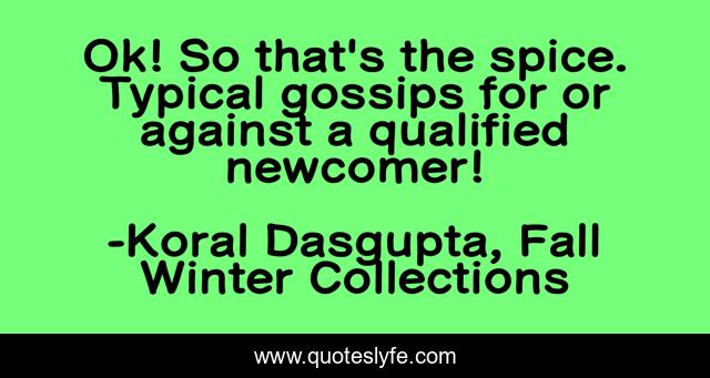This page presents the quote "Ok! So that's the spice. Typical gossips for or against a qualified newcomer!". Author of this quote is Koral Dasgupta, Fall Winter Collections. This quote is about artists-life, art, artist, romance, fictions, love-story,.
