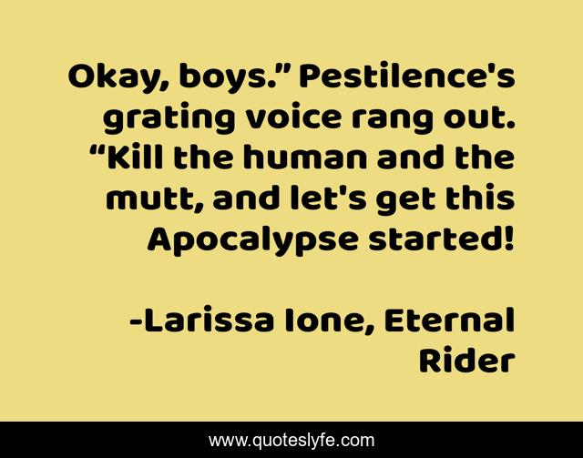This page presents the quote "Okay, boys.” Pestilence's grating voice rang out. “Kill the human and the mutt, and let's get this Apocalypse started!". Author of this quote is Larissa Ione, Eternal Rider. .