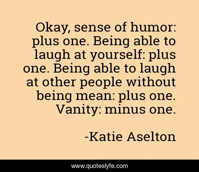 This page presents the quote "Okay, sense of humor: plus one. Being able to laugh at yourself: plus one. Being able to laugh at other people without being mean: plus one. Vanity: minus one.". Author of this quote is Katie Aselton. This quote is about yourself, laugh, people,.