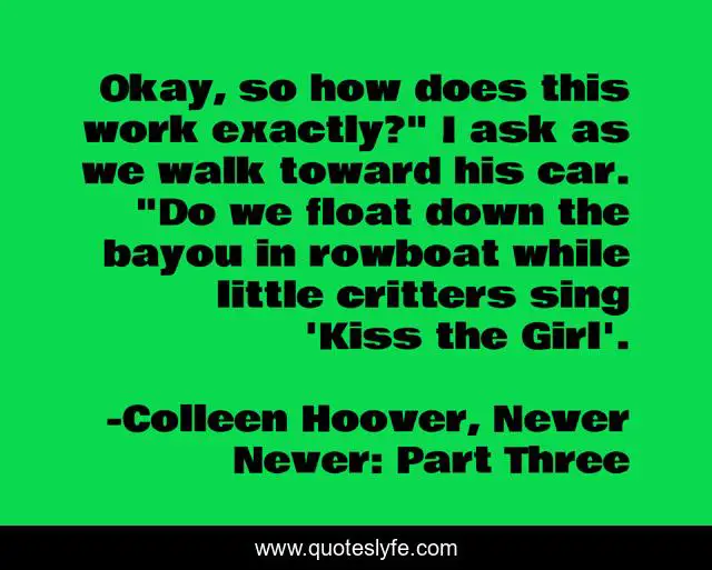 This page presents the quote "Okay, so how does this work exactly?" I ask as we walk toward his car. "Do we float down the bayou in rowboat while little critters sing 'Kiss the Girl'.". Author of this quote is Colleen Hoover, Never Never: Part Three. This quote is about love, humour, affection, disney,.