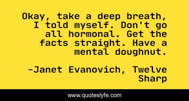 This page presents the quote "Okay, take a deep breath, I told myself. Don't go all hormonal. Get the facts straight. Have a mental doughnut.". Author of this quote is Janet Evanovich, Twelve Sharp. This quote is about humor, women,.