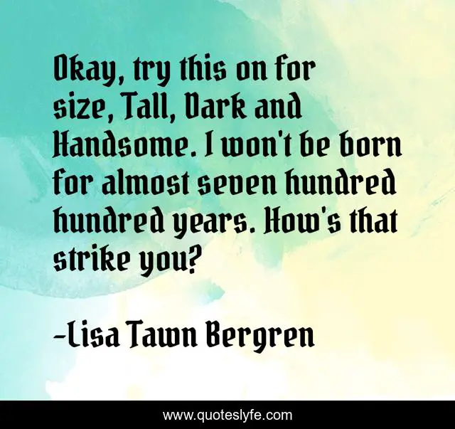 This page presents the quote "Okay, try this on for size, Tall, Dark and Handsome. I won't be born for almost seven hundred hundred years. How's that strike you?". Author of this quote is Lisa Tawn Bergren. This quote is about ya, time-travel,.