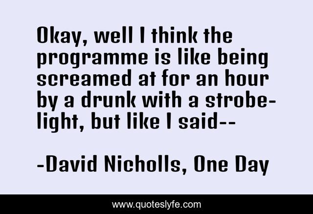 This page presents the quote "Okay, well I think the programme is like being screamed at for an hour by a drunk with a strobe-light, but like I said--". Author of this quote is David Nicholls, One Day. This quote is about funny, saracasm, comedy, hilarious,.