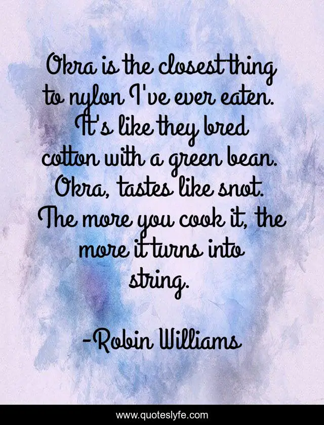 This page presents the quote "Okra is the closest thing to nylon I've ever eaten. It's like they bred cotton with a green bean. Okra, tastes like snot. The more you cook it, the more it turns into string.". Author of this quote is Robin Williams. This quote is about green, cotton,.