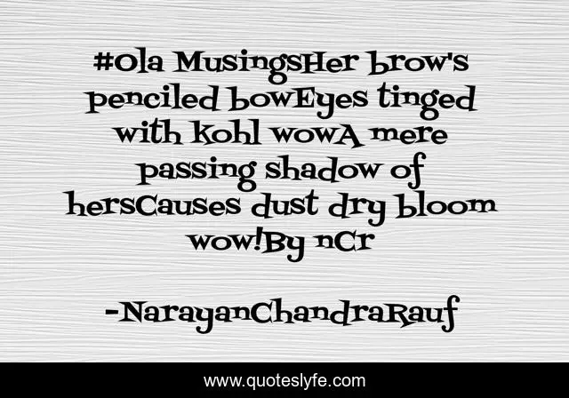 This page presents the quote "#Ola MusingsHer brow's penciled bowEyes tinged with kohl wowA mere passing shadow of hersCauses dust dry bloom wow!By nCr". Author of this quote is NarayanChandraRauf. This quote is about romance, poem, love, poetry, affection,.