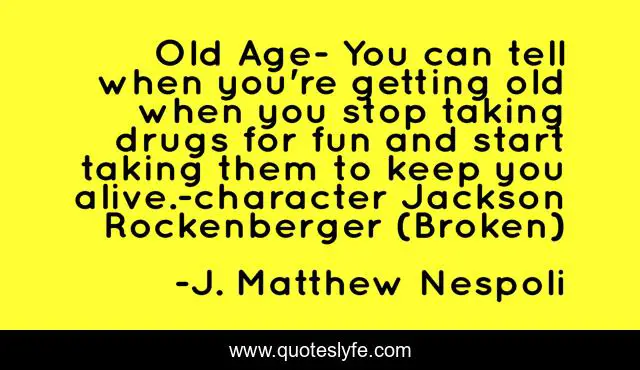 This page presents the quote "Old Age- You can tell when you're getting old when you stop taking drugs for fun and start taking them to keep you alive.-character Jackson Rockenberger (Broken)". Author of this quote is J. Matthew Nespoli. This quote is about drugs, aging, pain, pain-pills, old-age,.