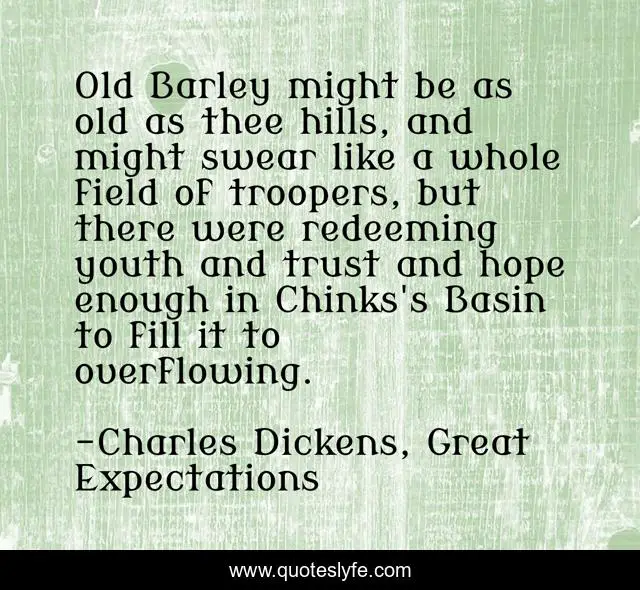 This page presents the quote "Old Barley might be as old as thee hills, and might swear like a whole field of troopers, but there were redeeming youth and trust and hope enough in Chinks's Basin to fill it to overflowing.". Author of this quote is Charles Dickens, Great Expectations. This quote is about home, family,.