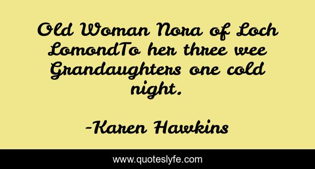 This page presents the quote "Old Woman Nora of Loch LomondTo her three wee Grandaughters one cold night.". Author of this quote is Karen Hawkins. This quote is about karen-hawkins, romance,.