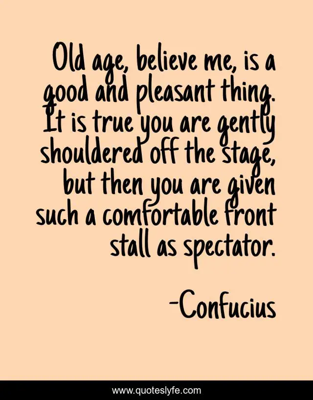 This page presents the quote "Old age, believe me, is a good and pleasant thing. It is true you are gently shouldered off the stage, but then you are given such a comfortable front stall as spectator.". Author of this quote is Confucius. This quote is about me, good, believe,.