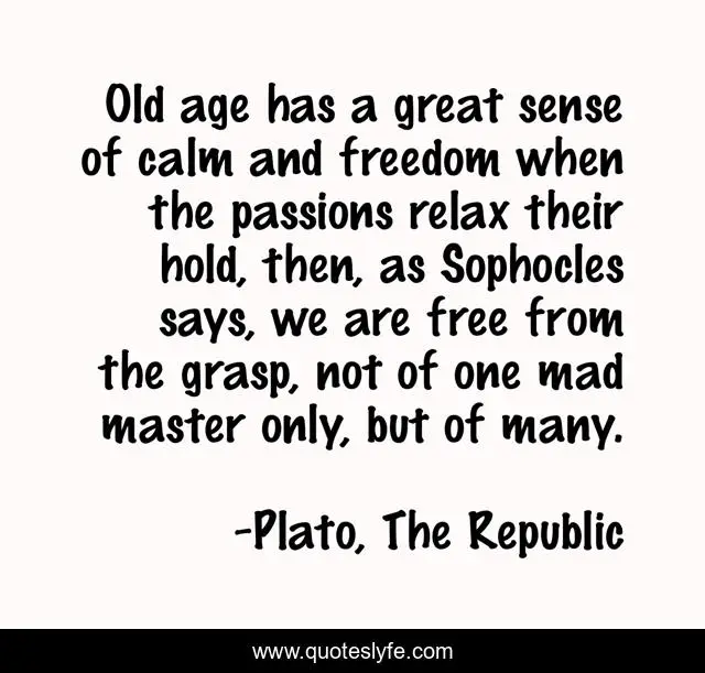 This page presents the quote "Old age has a great sense of calm and freedom when the passions relax their hold, then, as Sophocles says, we are free from the grasp, not of one mad master only, but of many.". Author of this quote is Plato, The Republic. This quote is about maturation, emotions, impulsiveness,.