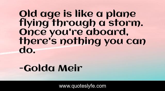 This page presents the quote "Old age is like a plane flying through a storm. Once you're aboard, there's nothing you can do.". Author of this quote is Golda Meir. This quote is about flying, old age, storm,.