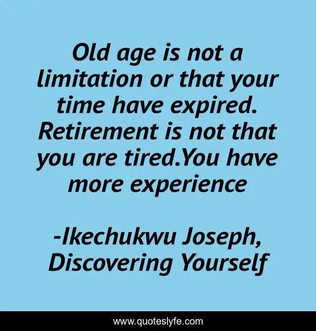 This page presents the quote "Old age is not a limitation or that your time have expired. Retirement is not that you are tired.You have more experience". Author of this quote is Ikechukwu Joseph, Discovering Yourself. This quote is about self-discovery, discoveringyourself, self-improvement,.