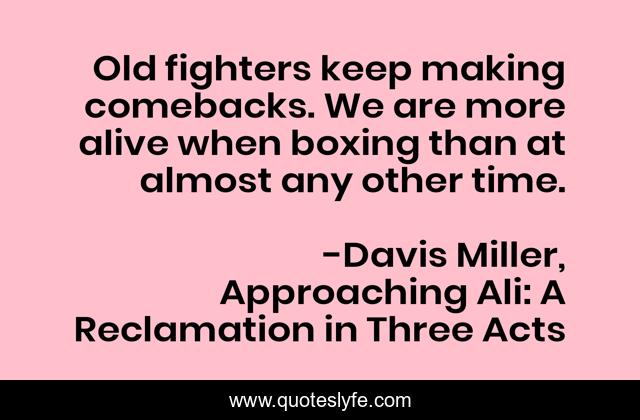 This page presents the quote "Old fighters keep making comebacks. We are more alive when boxing than at almost any other time.". Author of this quote is Davis Miller, Approaching Ali: A Reclamation in Three Acts. This quote is about job, vocation, calling, spiritual-warfare,.