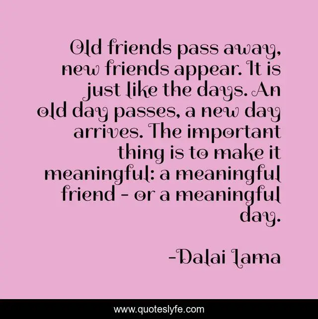This page presents the quote "Old friends pass away, new friends appear. It is just like the days. An old day passes, a new day arrives. The important thing is to make it meaningful: a meaningful friend - or a meaningful day.". Author of this quote is Dalai Lama. This quote is about old friends, friends, day,.