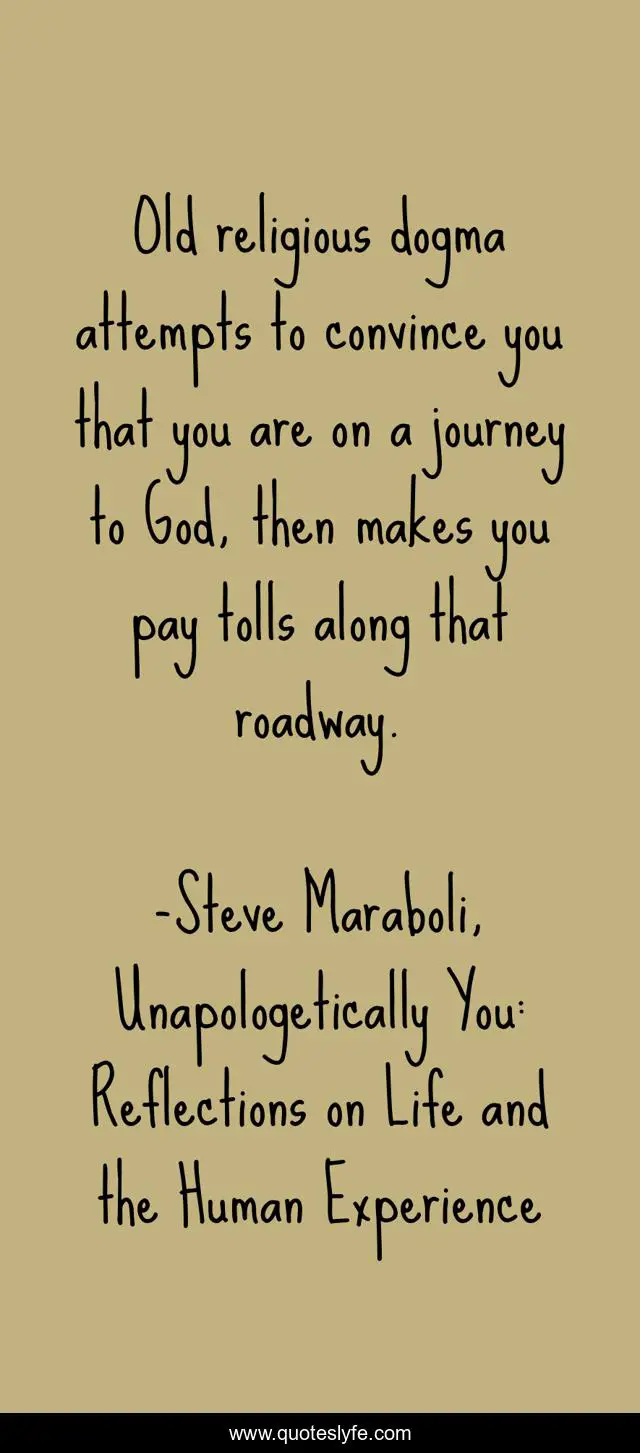 This page presents the quote "Old religious dogma attempts to convince you that you are on a journey to God, then makes you pay tolls along that roadway.". Author of this quote is Steve Maraboli, Unapologetically You: Reflections on Life and the Human Experience. This quote is about roadway, pay-tools, religion, god, dogma, journey,.
