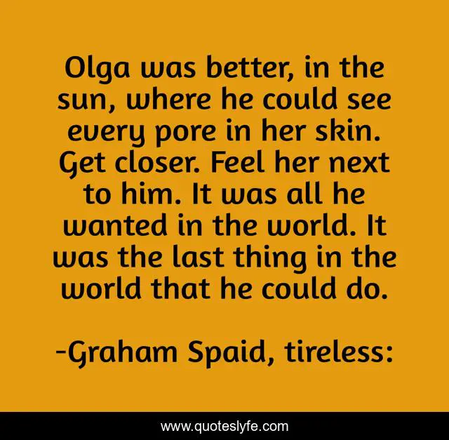 This page presents the quote "Olga was better, in the sun, where he could see every pore in her skin. Get closer. Feel her next to him. It was all he wanted in the world. It was the last thing in the world that he could do.". Author of this quote is Graham Spaid, tireless:. This quote is about humor, humorous-fiction, satire, literary-fiction,.