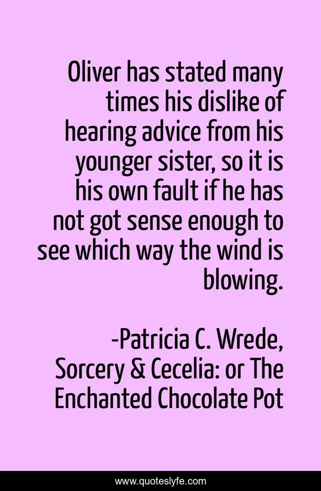 This page presents the quote "Oliver has stated many times his dislike of hearing advice from his younger sister, so it is his own fault if he has not got sense enough to see which way the wind is blowing.". Author of this quote is Patricia C. Wrede, Sorcery & Cecelia: or The Enchanted Chocolate Pot. This quote is about ignored, brothers, funny, advice, stupidity, siblings, common-sense, comedy,.