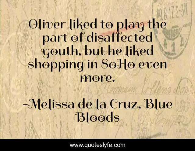 This page presents the quote "Oliver liked to play the part of disaffected youth, but he liked shopping in SoHo even more.". Author of this quote is Melissa de la Cruz, Blue Bloods. .