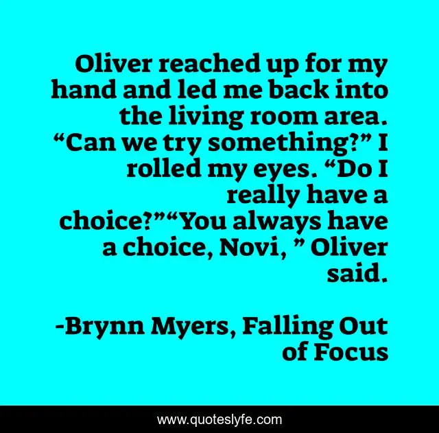 This page presents the quote "Oliver reached up for my hand and led me back into the living room area. “Can we try something?” I rolled my eyes. “Do I really have a choice?”“You always have a choice, Novi, ” Oliver said.". Author of this quote is Brynn Myers, Falling Out of Focus. This quote is about dark-alice-in-wonderland, fantasy, fae, otters, self-discovery,.