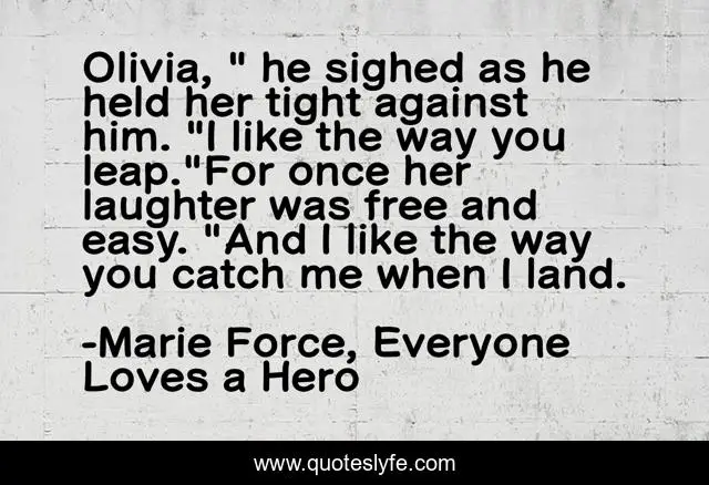 This page presents the quote "Olivia, " he sighed as he held her tight against him. "I like the way you leap."For once her laughter was free and easy. "And I like the way you catch me when I land.". Author of this quote is Marie Force, Everyone Loves a Hero. This quote is about romance, everyone-loves-a-hero, marie-force,.