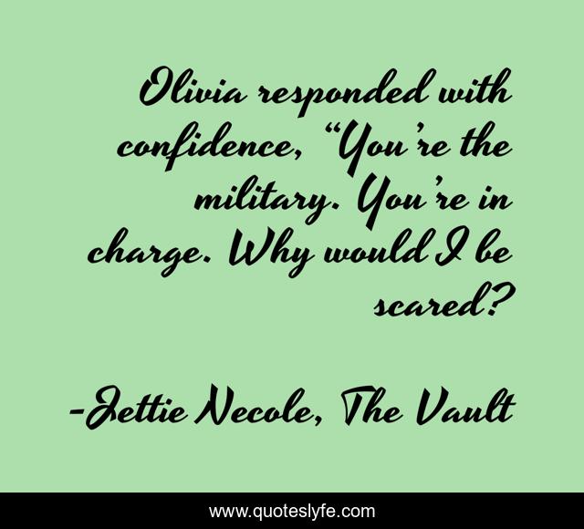 This page presents the quote "Olivia responded with confidence, “You’re the military. You’re in charge. Why would I be scared?". Author of this quote is Jettie Necole, The Vault. This quote is about apocalypse, new-adult-dystopian-romance,.