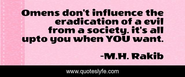 This page presents the quote "Omens don't influence the eradication of a evil from a society. it's all upto you when YOU want.". Author of this quote is M.H. Rakib. This quote is about life, eradication, people, evil, quotes, omens, society,.