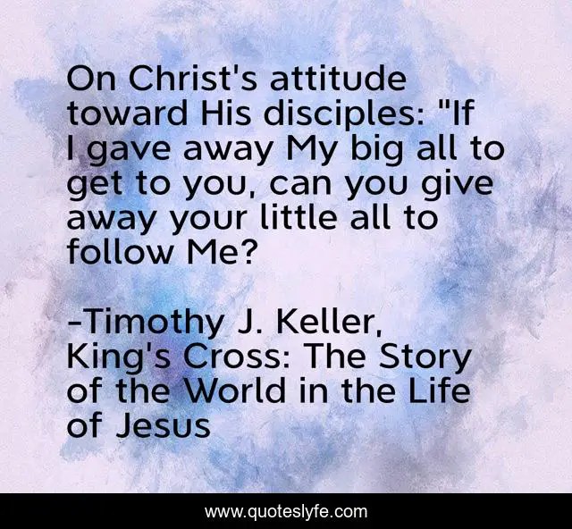 This page presents the quote "On Christ's attitude toward His disciples: "If I gave away My big all to get to you, can you give away your little all to follow Me?". Author of this quote is Timothy J. Keller, King's Cross: The Story of the World in the Life of Jesus. This quote is about discipleship, materialism,.