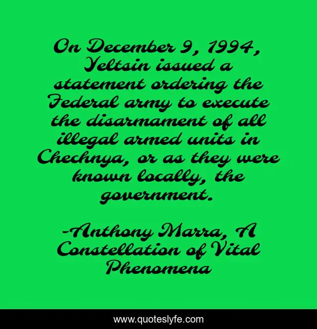 "Anthony Marra, A Constellation of Vital Phenomena Quotes." Quoteslyfe.com, 2025. Sat. 06 Dec. 2025. <https://www.quoteslyfe.com/quote/On-December-9-1994-Yeltsin-issued-a-174098>.