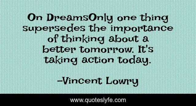 This page presents the quote "On DreamsOnly one thing supersedes the importance of thinking about a better tomorrow. It's taking action today.". Author of this quote is Vincent Lowry. This quote is about quote, dreams, vincent-lowry, 2012,.