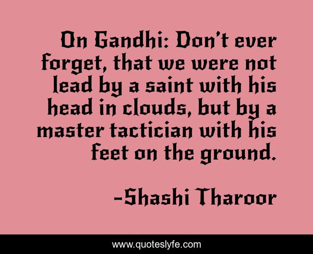 This page presents the quote "On Gandhi: Don’t ever forget, that we were not lead by a saint with his head in clouds, but by a master tactician with his feet on the ground.". Author of this quote is Shashi Tharoor. .