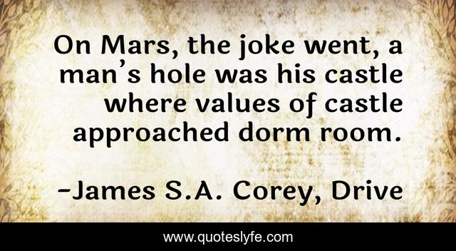 This page presents the quote "On Mars, the joke went, a man’s hole was his castle where values of castle approached dorm room.". Author of this quote is James S.A. Corey, Drive. This quote is about joke, dorm-room, engineering, mars, mathematics, castle,.