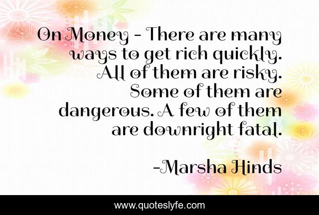 This page presents the quote "On Money - There are many ways to get rich quickly. All of them are risky. Some of them are dangerous. A few of them are downright fatal.". Author of this quote is Marsha Hinds. This quote is about danger, wealth, fatality, risk,.