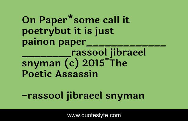 This page presents the quote "On Paper*some call it poetrybut it is just painon paper_____________________rassool jibraeel snyman (c) 2015"The Poetic Assassin". Author of this quote is rassool jibraeel snyman. This quote is about poetry-life, quotes-love, lovers, philosophy, poetry,.