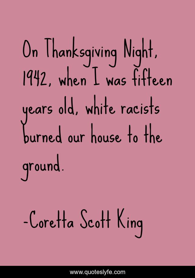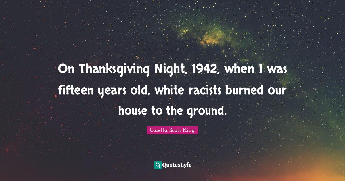 This page presents the quote "On Thanksgiving Night, 1942, when I was fifteen years old, white racists burned our house to the ground.". Author of this quote is Coretta Scott King. This quote is about house, night, years,.