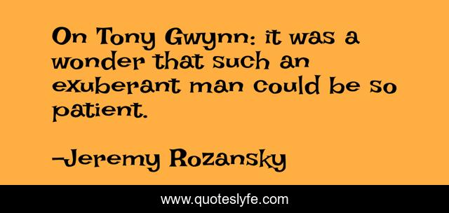 This page presents the quote "On Tony Gwynn: it was a wonder that such an exuberant man could be so patient.". Author of this quote is Jeremy Rozansky. This quote is about enthusiasm, maturity, wisdom,.
