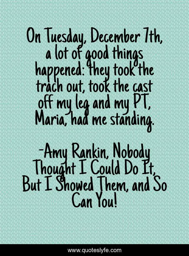 This page presents the quote "On Tuesday, December 7th, a lot of good things happened: they took the trach out, took the cast off my leg and my PT, Maria, had me standing.". Author of this quote is Amy Rankin, Nobody Thought I Could Do It, But I Showed Them, and So Can You!. This quote is about enthusiasm, book, inspirational,.